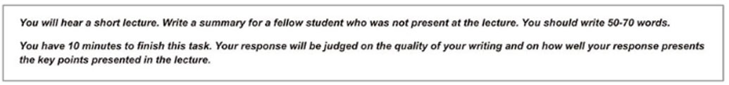 شما باید خلاصه ای در حدود 50 تا 70 کلمه از یک سخنرانی بنویسید. در این نوع سوال مهارت listening(گوش کردن) و writing(نوشتن) شما را ارزیابی می شود.