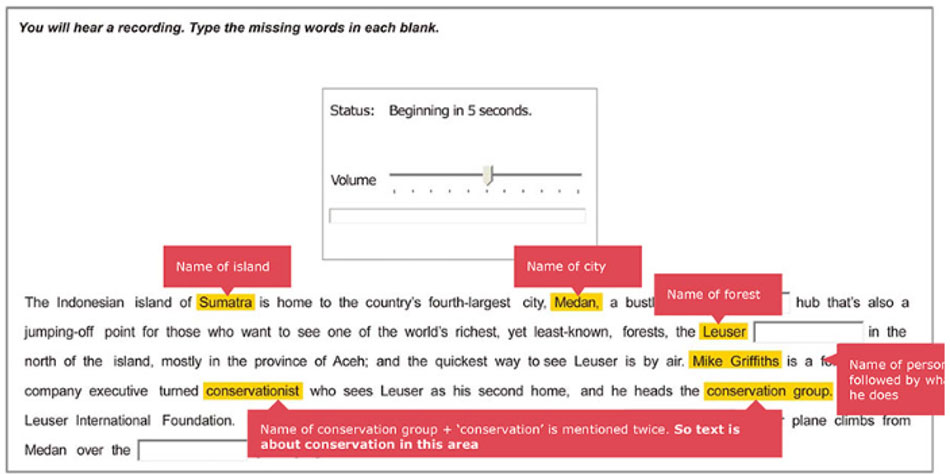 - پیش از پخش فایل صوتی، متن آن را بخوانید: حتی اگر نمی توانید همه ی متن فایل صوتی را بخوانید، از هر چه که بتوانید بخوانید بهره می برید. دانستن کلمه های اطراف جای خالی به شما می فهماند که به دنبال چه چیزی باشید. تمرکز شما بر پیدا کردن کلمه های مناسب جاهای خالی در فایل صوتی خواهد بود.