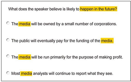 برای نمونه در مثال زیر، سوال نشان می دهد که گوینده درباره ی آینده صحبت خواهد کرد و در همه ی گزینه ها کلمه ی media ذکر شده است.