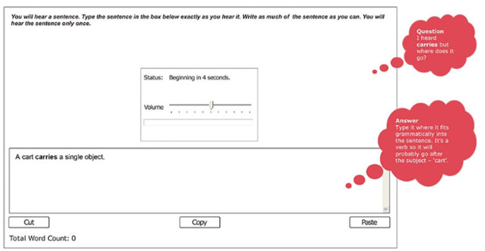 - ممکن است صحیح نوشتن کل جمله همزمان با گوش کردن به آن، چالش برانگیز باشد. همچنین بعضی از این جمله ها ممکن است طولانی باشند. در این مواقع نوشتن آن ها مستقیما در کادر پاسخ مشکل می شود.