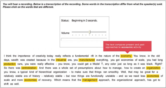 در این نوع سوال، متن یک سخنرانی به شما نمایش داده می شود که چند اشتباه در متن وجود دارد. در حالی که همزمان به فایل صوتی در حال پخش گوش می کنید و متن را می خوانید، باید کلمه هایی از متن را که با فایل صوتی در حال پخش متفاوت هستند، انتخاب کنید.