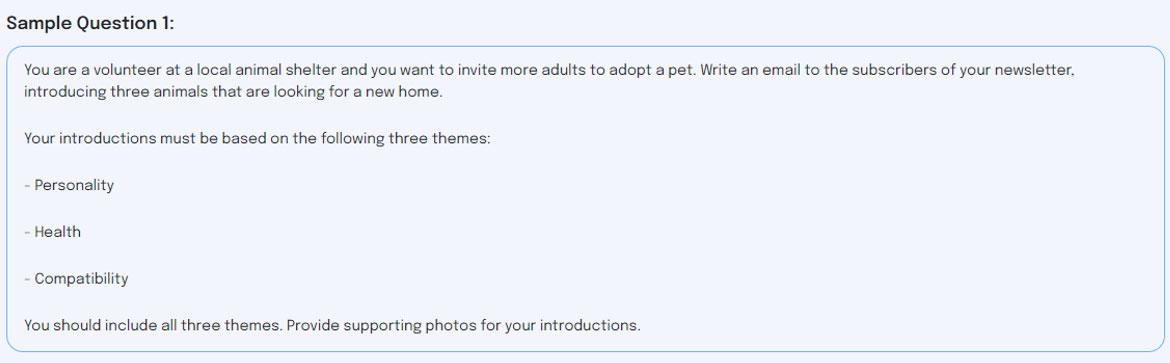 در این نوع سوال باید یک سخنرانی را برای همکلاسی خود که نتوانسته در کلاس شرکت کند خلاصه کنید. 20 تا 30 کلمه در خلاصه ی خود بنویسید. 8 دقیقه برای این سوال فرصت دارید. خلاصه ی شما بر اساس کیفیت نوشتن شما و درک نکات اصلی سخنرانی ارزیابی می شود.
