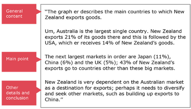 اگر صحبت خود را سازماندهی کنید نمره ی بهتری خواهید گرفت. به این خاطر که یک پاسخ سازماندهی شده به احتمال زیاد اطلاعات اصلی و جزئیات اضافه را پوشش می دهد و هم چنین بر اساس اطلاعات موجود درباره ی معانی و نتیجه گیری ها صحبت می کند. به سازماندهی توصیف یک عکس در مثال زیر توجه کنید: